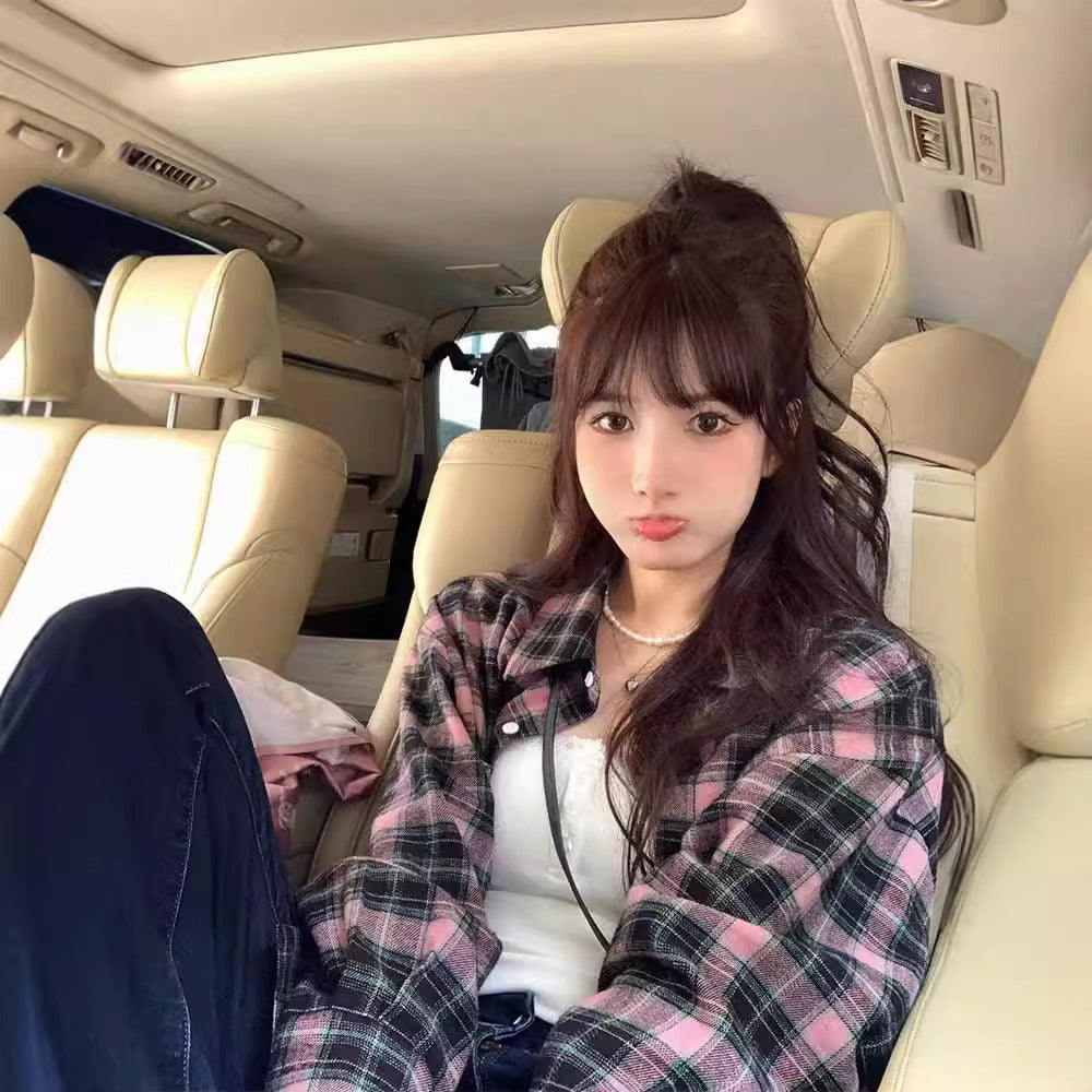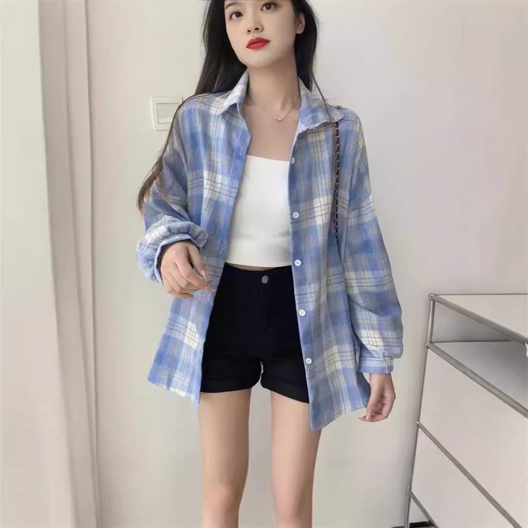 Product information: Pattern: Plaid Fabric name: Polyester Color: black and pink plaid, sky blue plaid, apricot Sleeve type: shirt sleeve Size: free size 40.00 kg-70.00kg Version: Loose Sleeve length: long sleeve